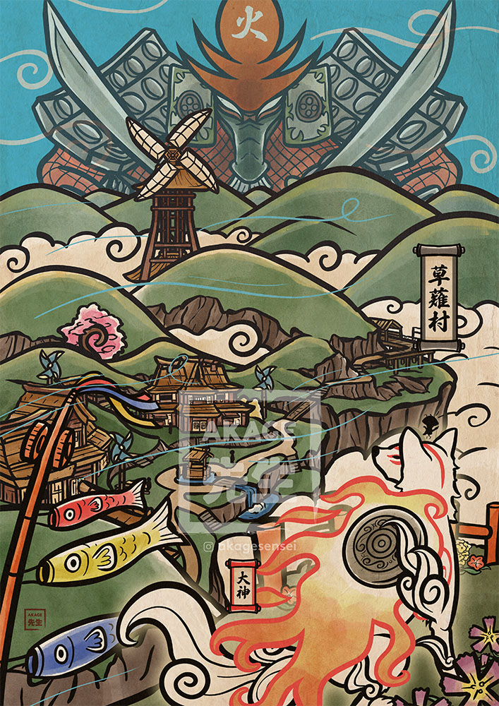 La Campagne de Takamiya est la deuxième grande zone du jeu, et plus précisément dans le village Kusanagi, une zone très montagneuse et venteuse. La vie du village est rythmée par l’énergie du vent, qui a disparu depuis l’apparition de Casque Ardent, un démon bœuf qui a pris possession du Sanctuaire du Vent. Heureusement, Shiranui/Amaterasu a sauvé les habitants en lui réglant son compte !