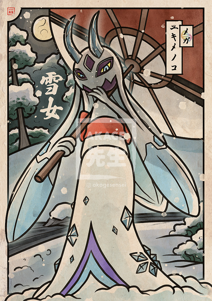 Je réalise une petite série sur les Méga évolutions de Pokémon Legends Z-A. J’aime beaucoup Momartik de base, avec son inspiration de la célèbre Yukionna. Toute sa famille d’ailleurs est inspirée de yokai : Stalgamin est un Yukinko, et Oniglali est un oni (démon/ogre) des neiges. Avec sa nouvelle Méga, Momartik voit son inspiration de Yukionna bien plus présente : le kimono est plus explicite, une longue chevelure blanche se forme, et un regard plus froid et glaçant se dessine. J’aime le fait que M-Momartik semble plus méchante et dangereuse, ça lui donne un côté « yandere » qui est déjà assez présent dans le conte de Yukionna.