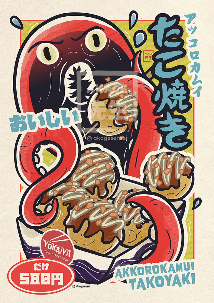 Le concept de Yōkaiya : j’ai imaginé une enseigne d’izakaya yōkai, avec toute une charte graphique inspirée de la restauration rapide japonaise. Je représente différents plats typiques japonais, plus ou moins connus, couplés avec un yōkai, une créature issue du folklore japonais. Nous avons à chaque fois une certaine logique entre le plat présenté et sa créature qui lui est rattachée. Chaque illustration peut être interprétée comme une page de menu, avec le plat et son prix, le but étant de vous faire découvrir la richesse et la diversité culinaire nippone !
