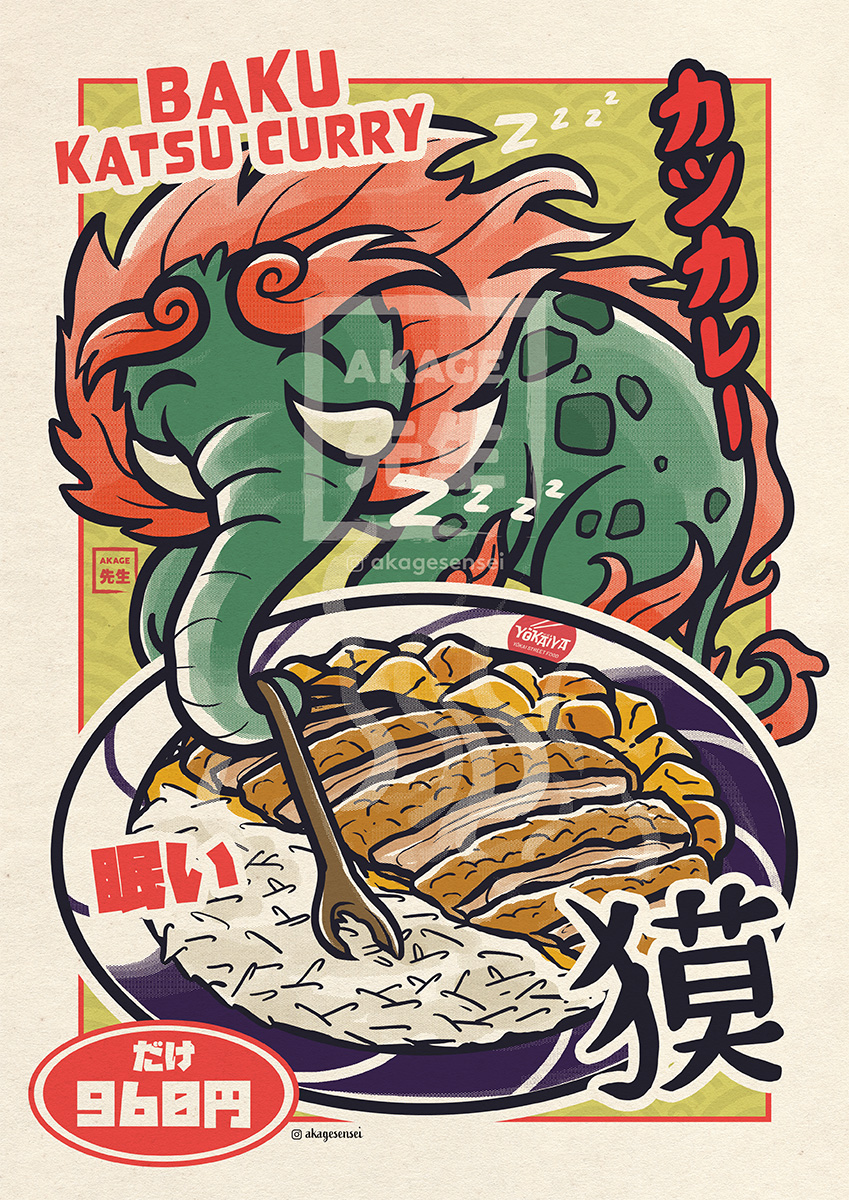 Notre ami le Baku lui, est un yōkai originaire de Chine, qui se nourrit des rêves des humains. Il a en Chine l’apparence d’une chimère avec une trompe et au Japon celle d’un tapir. Le Baku est plutôt utile en réalité car il se nourrit également des mauvais rêves et cauchemars, nous permettant de profiter de nuits plus réparatrices ! Le Baku Katsu Curry que je vous propose ici vous permettra de profiter d’un meilleur sommeil si vous le dégustez avant de dormir, voire même de profiter de rêves lucides. Pratique si vous souffrez d’insomnies chroniques. Quoi ? Vous pensez que j’essaie de vous droguer là ? Mais pas du tout !