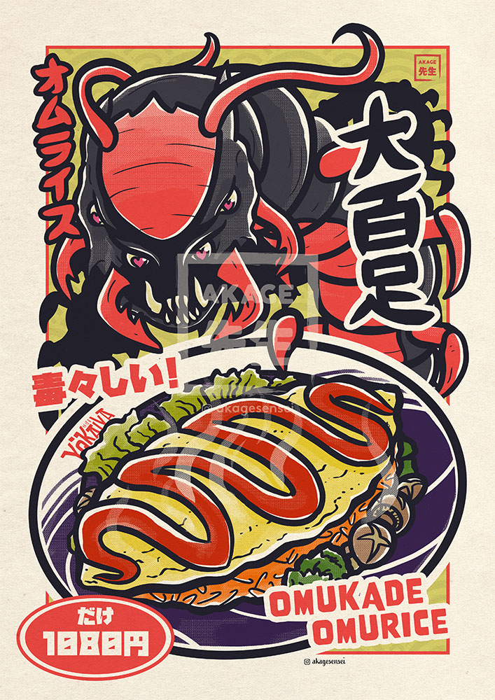 Quand il est préparé par mon ami l’Omukade, l’omurice est agrémenté de son venin toxique, ce qui lui donne un petit goût spécial… Allez, je suis sûr que vous allez adorer ! Vous ne connaissez pas l’omukade ? C’est un mignon petit yokai qui ressemble à un mille pattes géant qui fait la taille d’une montagne. Il adore dévorer les humains et vivre dans des grottes.
