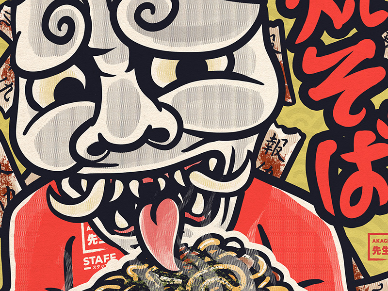 Le concept de Yōkaiya : j’ai imaginé une enseigne d’izakaya yōkai, avec toute une charte graphique inspirée de la restauration rapide japonaise. Je représente différents plats typiques japonais, plus ou moins connus, couplés avec un yōkai, une créature issue du folklore japonais. Nous avons à chaque fois une certaine logique entre le plat présenté et sa créature qui lui est rattachée. Chaque illustration peut être interprétée comme une page de menu, avec le plat et son prix, le but étant de vous faire découvrir la richesse et la diversité culinaire nippone !