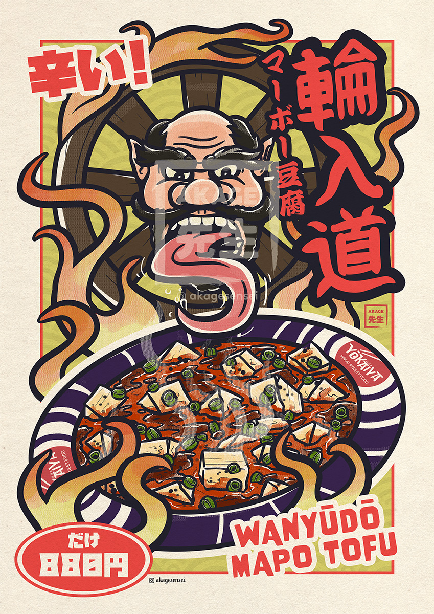 Le Wanyūdō lui est un yōkai issu de légendes et de croyances bouddhistes, ayant l’apparence d’une roue de char enflammée avec une tête humaine en son centre. Se déplaçant en roulant à vive allure, et vivant dans les Enfers (bouddhistes), les Wanyūdō viendraient parfois dans notre monde pour arracher les âmes perfides et les ramener chez eux. Les daimyo (gouverneurs) les plus cruels, ayant torturé avec plaisir de nombreux habitants avec un char à bœufs, seraient devenus ce genre particulier de yōkai. Les Wanyūdō sont condamnés à souffrir pour l’éternité, brûlés et écorchés vifs par le mouvement de la roue. Pas très fun, mais c’est ce qui m’a donné l’idée de rapprocher cette idée de brûlure vive et de flammes infernales avec la sensation en bouche de savourer son mapo tofu !