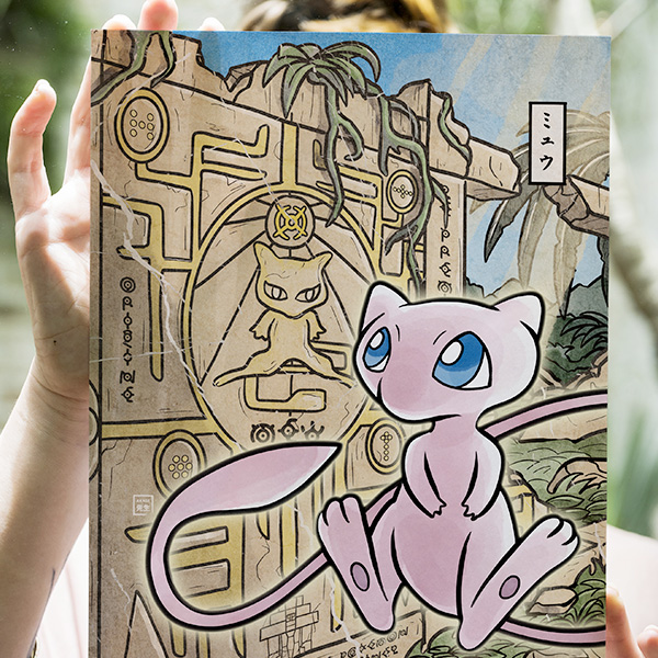 Cette illustration de Mew est inspirée de ses origines et légendes, popularisées au début des années 2000. La célèbre carte Mew Antique est la principale référence visuelle, mais vous retrouvez aussi des inspirations au premier film Pokémon sorti au cinéma, et d’autres références liées à sa description dans les jeux, notamment sa première apparition en Guyane.