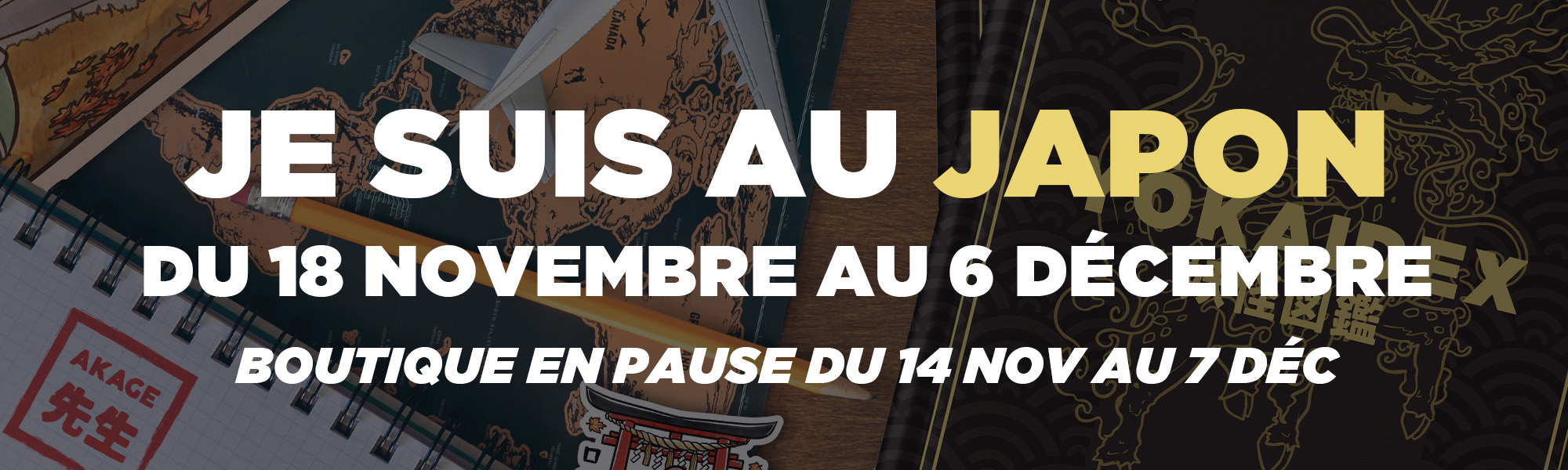 Votre très cher Akage prend des vacances et séjourne au Japon du 18 novembre au 6 décembre. La boutique est actuellement en pause. Autrement dit, toute commande réalisée dès aujourd’hui sera traitée à son retour dès le lundi 8 décembre. Vous pouvez tout de même commander en son absence afin que les commandes soient traitées rapidement à son retour, afin de les recevoir à temps à Noël. Les commandes expédiées à partir du 15 décembre ne seront pas assurées d’arriver à temps pour Noël : en cette période chargée, les délais d’envois des transporteurs sont allongés.
